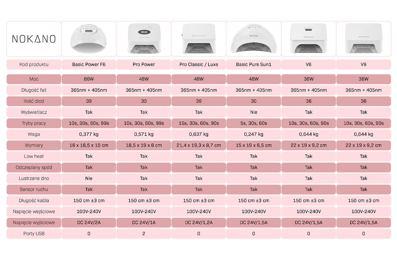 Poniżej znajdziesz tabelę porównawczą ze specyfikacją techniczną lamp do paznokci dostępnych w asortymencie Nokano: