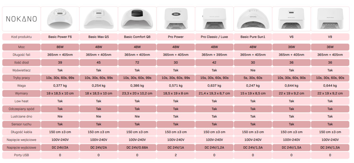 Poniżej znajdziesz tabelę porównawczą ze specyfikacją techniczną lamp do paznokci dostępnych w asortymencie Nokano: